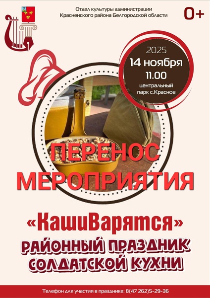 Дорогие друзья, в связи с погодными условиями районный праздник солдатской кухни «КашиВарятся» переносится!